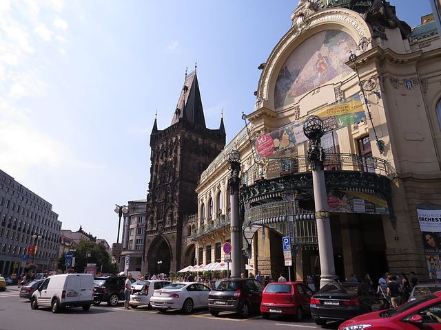 Lunetová mozaika na průčelí Obecního domu, který je od roku 1989 národní kulturní památkou, je zhotovena podle kresby Karla Špillara, Mirek vyfotil na konci srpna letošního roku objekt tak, aby zachytil i Prašnou bránu: