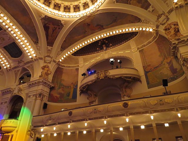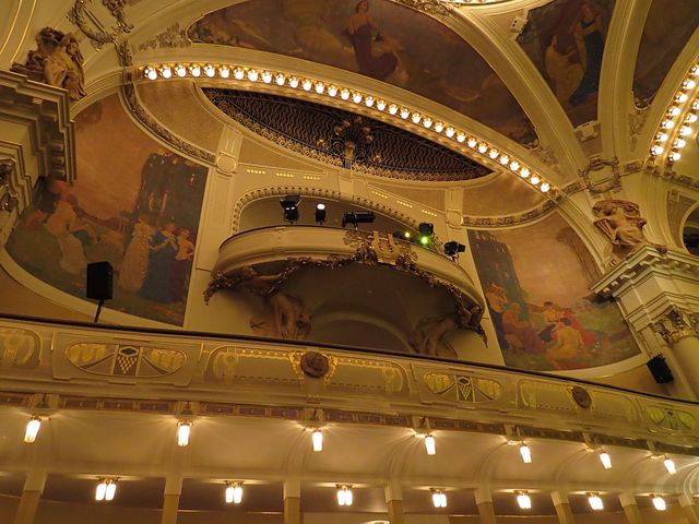 Po stranách pódia jsou sousoší Ladislava Šalouna Vyšehrad a Slovanské tance – nasvícena barevně působila díla atraktivně; nástropní malby ve Smetanově síni provedl František Ženíšek, balkónové výklenky s alegoriemi Hudby, Tance, Poezie a Dramatu jsou dílem Karla Špillara (M+M Svatošovi – Český les).