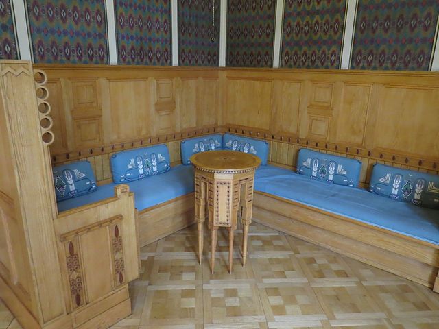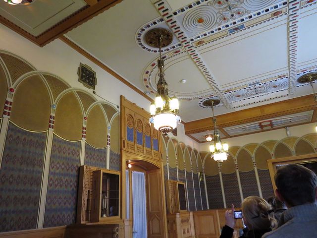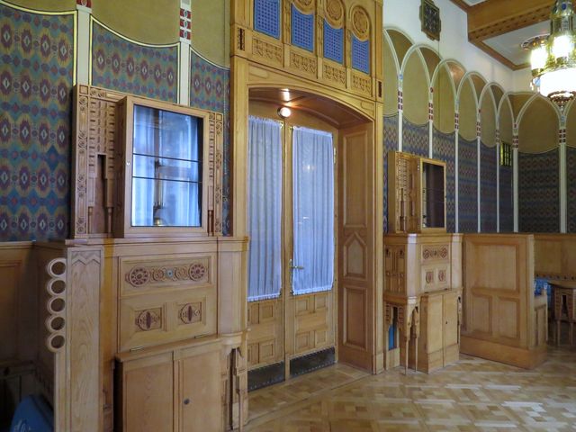 tapety a barevné ornamenty nad dřevěným obložením Orientálního salonku, stejně jako barevné stropní štuky, navozují tajemnou atmosféru, která mi maně připomněla snové komnaty granadské Alhambry…