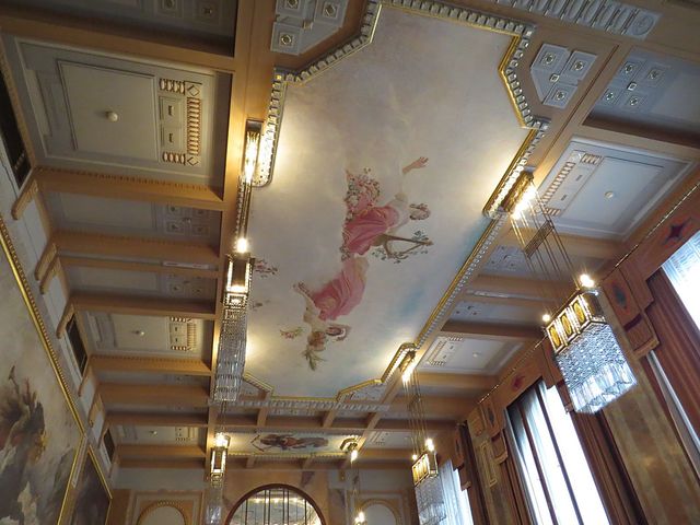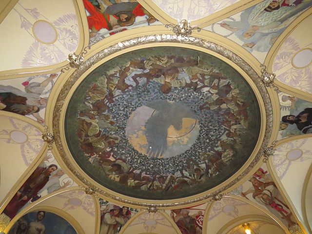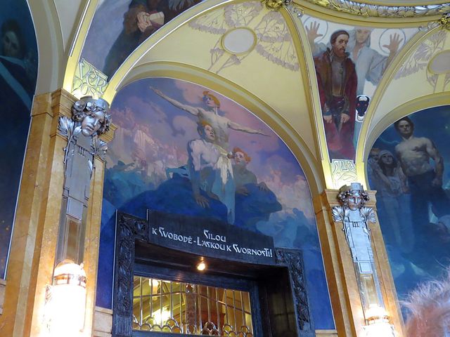 Výzdoby Primátorského sálu se ujal Alfons Mucha – nástropní malba se jmenuje Slovanská svornost s orlem, kol dokola na stěnách je osm občanských ctností personifikovaných významnými postavami české minulosti; také vitráže a osvětlení navrhl Alfons Mucha, který prý o tuto zakázku zvláště stál, proto ji udělal pod cenou – tak ho pomlouvali jeho závistiví současníci.