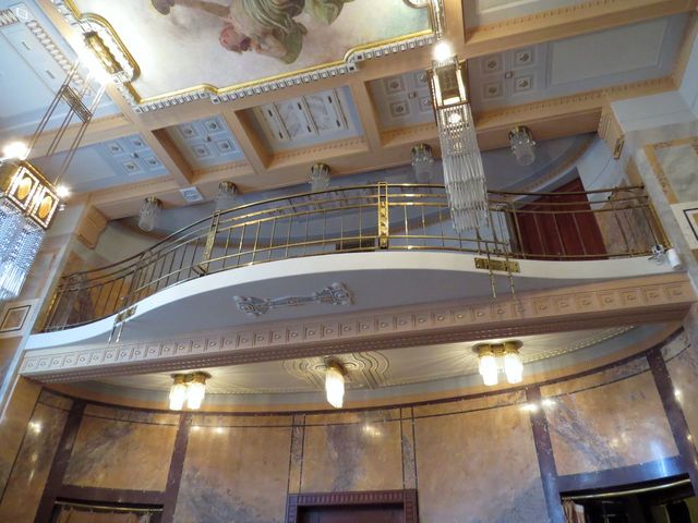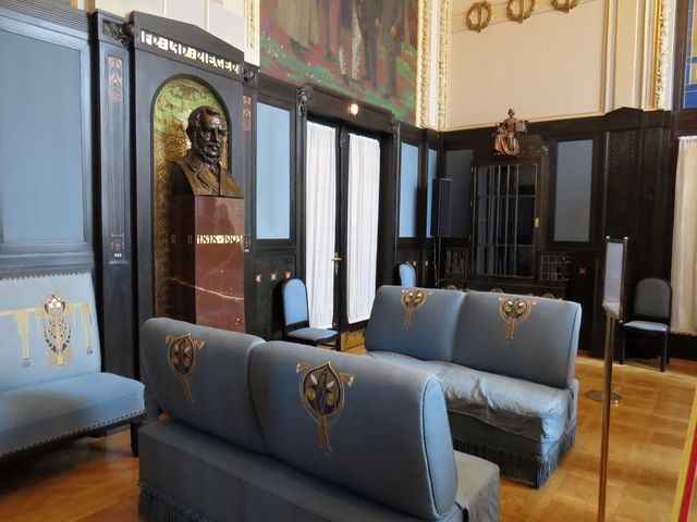 Se skvělou výzdobou nezůstal pozadu ani Riegrův sál – také busta Františka Ladislava Riegra (1818–1903) je dílem J. V. Myslbeka,