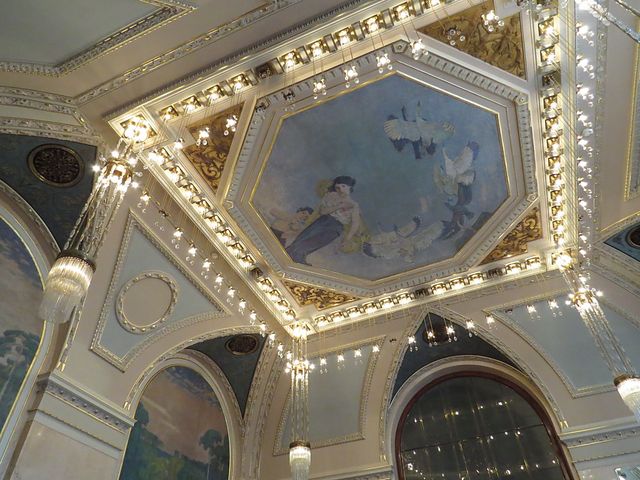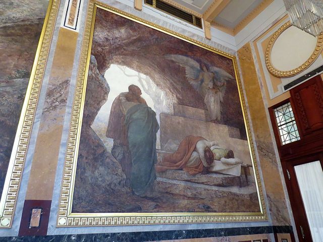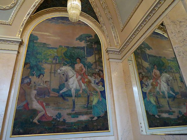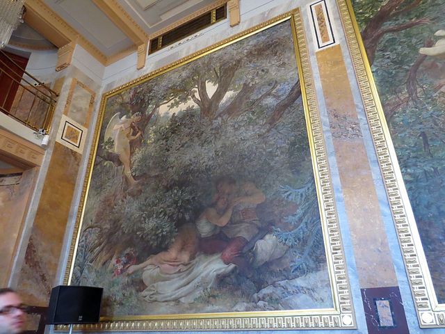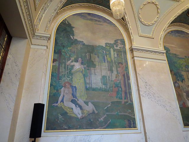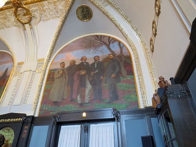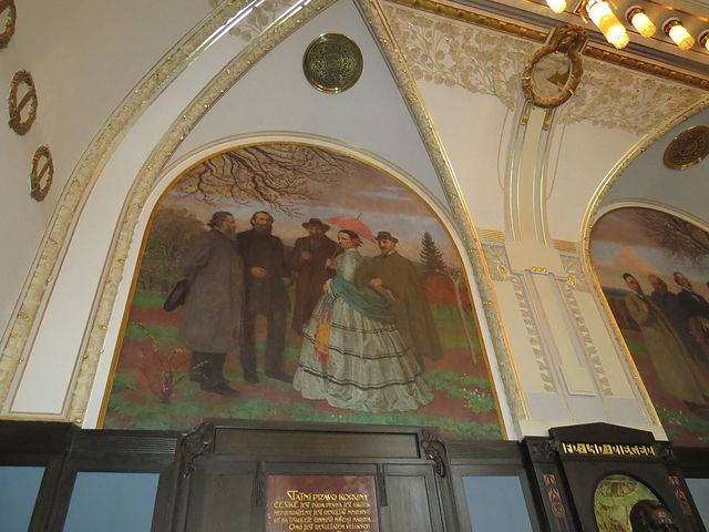 nástěnné malby vytvořil Max Švabinský a zvěčnil na nich podobizny největších českých umělců, na jedné, kterou nazval Jaro české literatury vidíme zleva Svatopluka Čecha, Jana Nerudu, Jaroslava Vrchlického a Julia Zeyera, v popředí Boženu Němcovou,