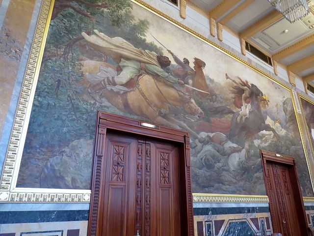 Palackého sálu dominují malby Jana Preislera, mezi okny trůní busta Františka Palackého (1798–1876) od samotného J. V. Myslbeka, originální svítidla vymyslel a dodal František Křižík.