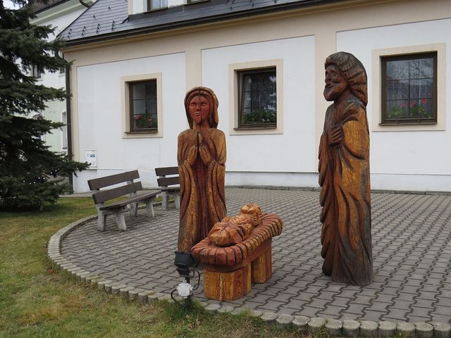 Stále jsme se drželi zelené značky a vydali se stoupavou silničkou k Filipovu – na rozcestí trpělivě snášela Svatá rodina zkoumavé pohledy kolemjdoucích a tvářila se tak přívětivě, jak jí motorovou pilou virtuózně vložil do výrazu autor Jaroslav Pecháček z Hanušovic.