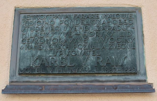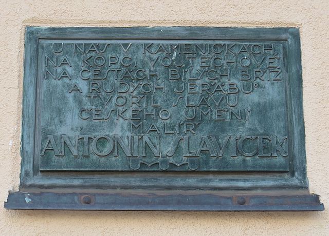 V Kameničkách stojí proti galerii, před níž jsou sochy malíře Antonína Slavíčka a spisovatele Karla Václava Raise, budova školy s pamětními deskami obou umělců.