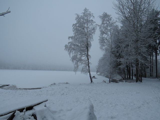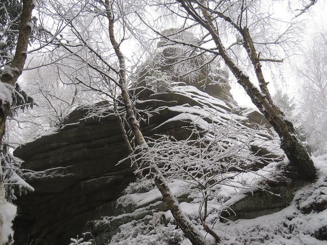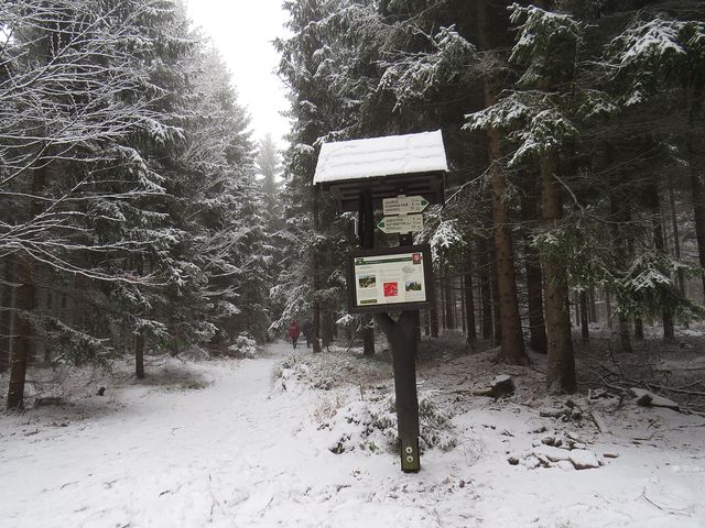 My jsme tentokrát spolu s Miluškou nasedli do auta Václava Plánky, který nás obezřetně provezl vysočinskou mlhou a silničkami znejistělými vysokou vrstvou rozbředlého sněhu do Řásné na parkoviště, odkud jsme se vydali po červeně značené cestě kolem Velkého Pařezitého rybníka a dále po zelené značce přes Míchovu skálu na Javořici.