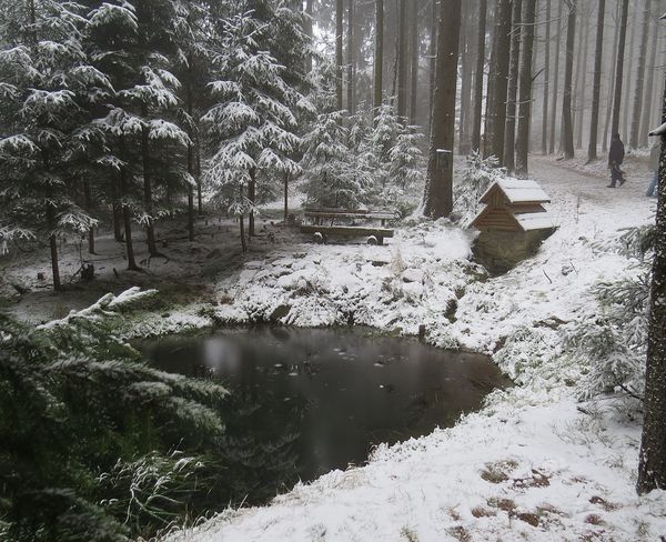 I známá studánka a pramenné jezírko při zelené značce k vrcholu Javořice vzaly na sebe kalendářový výraz, krotký a vlídný.