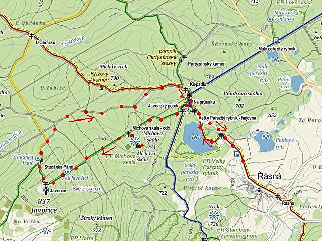 Trasa: Řásná ČTZ – Velký Pařezitý rybník ZTZ – Míchova skála – Javořice – Studánka Páně – ŽTZ – dále neznačenou cestou k ČTZ – Velký Pařezitý – Řásná = 10 km