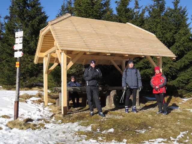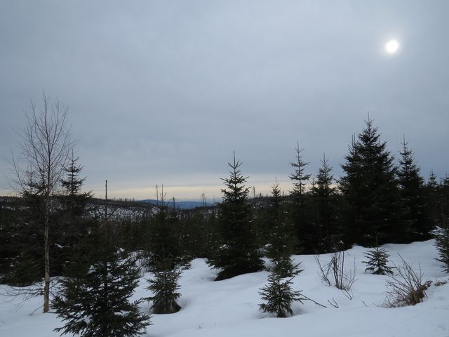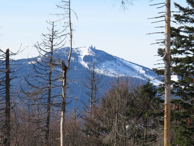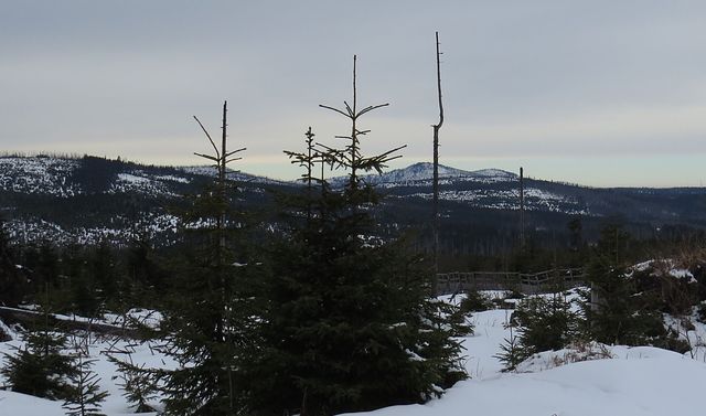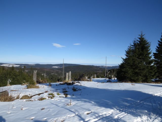 Vyfuněli jsme na Polom, jehož lesní kštice byla v roce 2007 smetena orkánem Kyrill, a kde z obnažených partií sníh v sálajícím slunci před očima mizel, odpočinuli si v novém přístřešku a poobědvali.