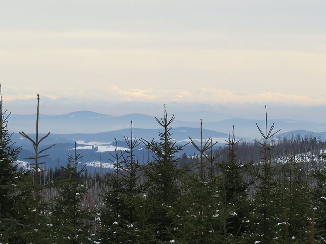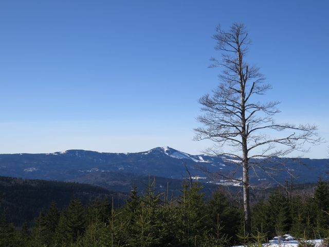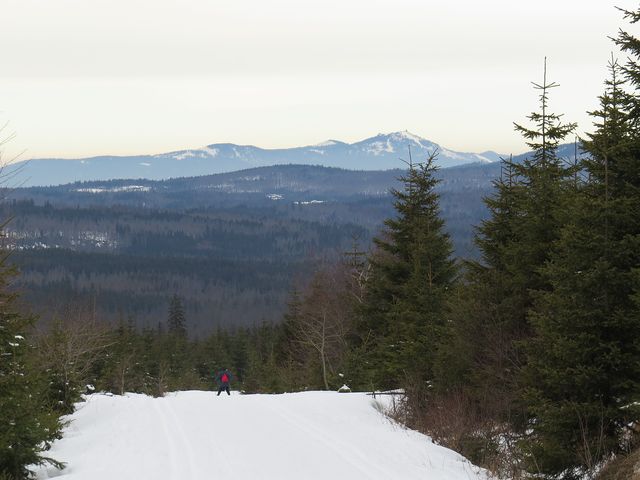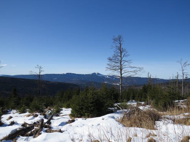 A tak jsme nespěchali a toulali se Sklářskou stezkou nad Železnou Rudou kolem zaniklé Pamferovy huti, pak rozsáhlými lesy s občasným výhledem na Pancíř a Hofmanky, pořád po dobré stopě až na rozcestí pod Debrníkem. V Zámeckém lese už jsme začali s výstupem na Polom. Každý, kdo to tu zná, ví, že hlavním tahákem túry je výhled na Velký Javor – je odtud při dobrém počasí opravdu báječný výhled! (M+M Svatošovi – Šumava – okolí Železné Rudy, jaro 2012).