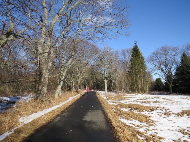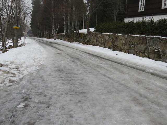 a na asfaltové silničce vedoucí k Vlčím jámám byly jen rozbředlé zbytky sněhu a ani největší zarputilci nedokázali lyžovat na této straně hory laskané sluncem… Šli jsme v lyžařských botách opatrným krokem klouzavou cestou dolů až na Hůrku a představovali si, jak by to frčelo, kdyby…