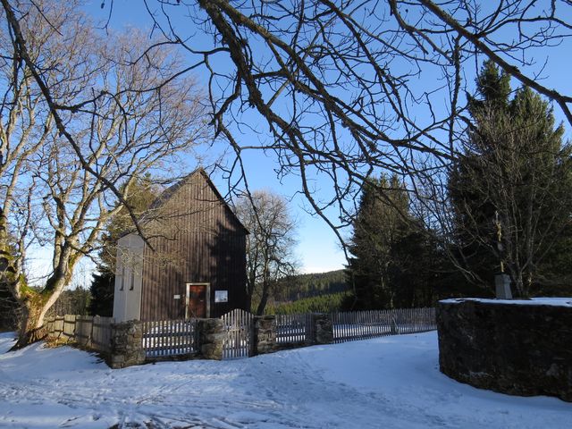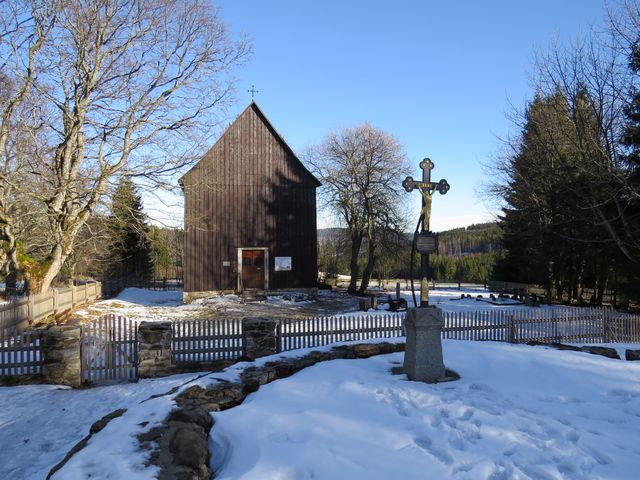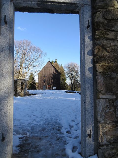 Na obrázku je kaple sv. Kříže postavená v roce 1820 jako hrobka sklářských rodin Abelů a Hafenbrändelů – tu Mirek vyfotil od vchodu bývalého kostela sv. Vincence, vysvěceného roku 1789. V té době tu pracovala výkonná sklářská huť, kterou si původně v roce 1725 pronajal teprve dvacetiletý Franz Abel, potomek zchudlých francouzských šlechticů, začal podnikat a jeho potomci v tom pokračovali dalších sto padesát let. K osadě, která kolem huti vznikla, přibyla pak v údolí obec Nová Hůrka, v níž sídlili sklářští dělníci – v době největšího rozkvětu jich prý pracovalo v podniku až 1 800!