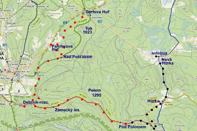Na mapce jsem červeně zakreslila trasu běžkařskou (asi 13 km), černé puntíky značí úsek pěší (8 km).