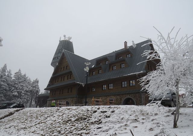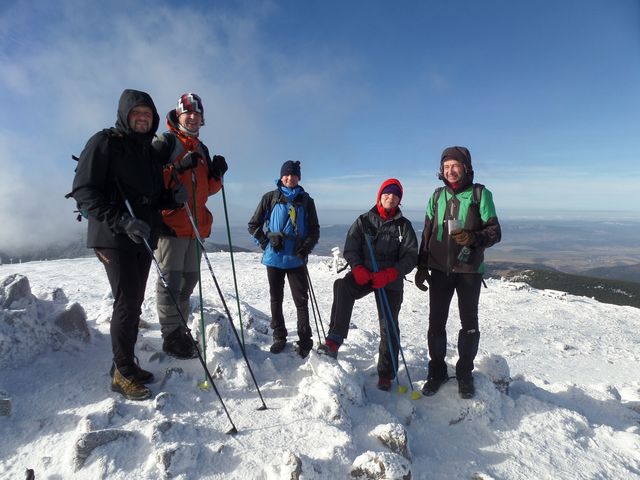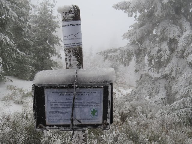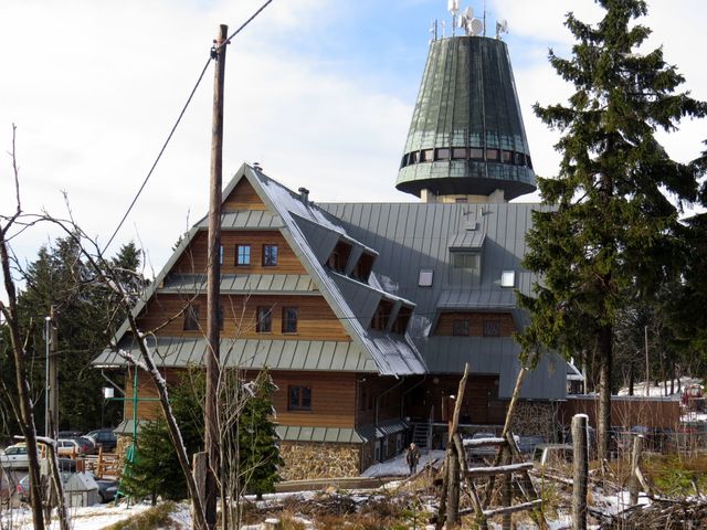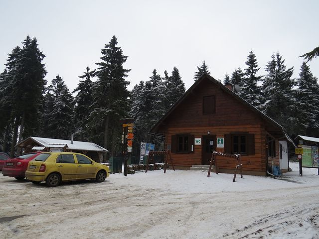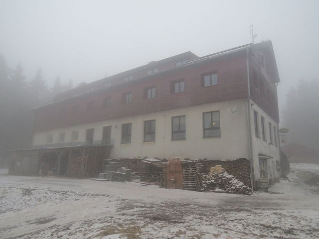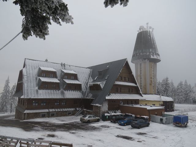 Tři kilometry ze sedla na vrcholek jsme jeli autem, u chaty panovaly zima, vítr a mlha, výhled pramizerný, ze zamrzlých okének rozhledny naprosto žádný.