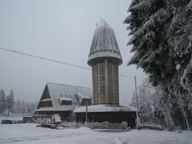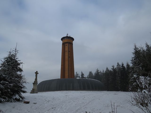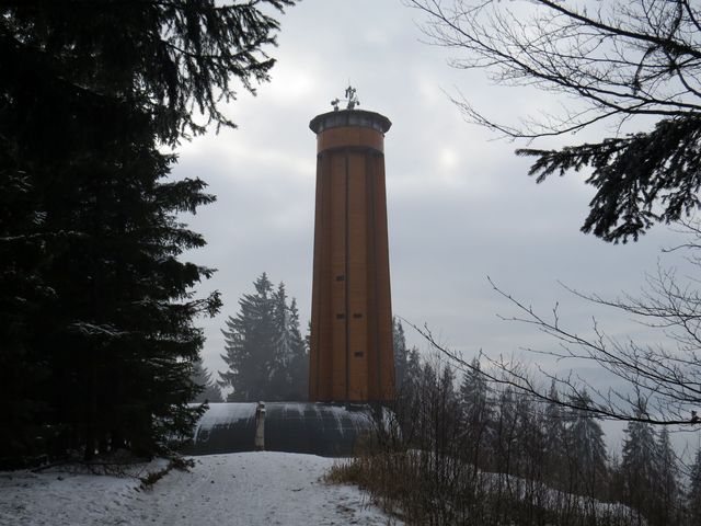 Na začátku třicátých let minulého století byla k chatě přistavěna vodárenská věž, kterou pak po úpravách změnili na rozhlednu – tu požár nezničil – je betonová, 33 metrů vysoká, na vyhlídkovou plošinu ve výšce 22 metrů vede 128 schodů, které bychom bývali rádi vyběhli, ale nebyl bohužel důvod…