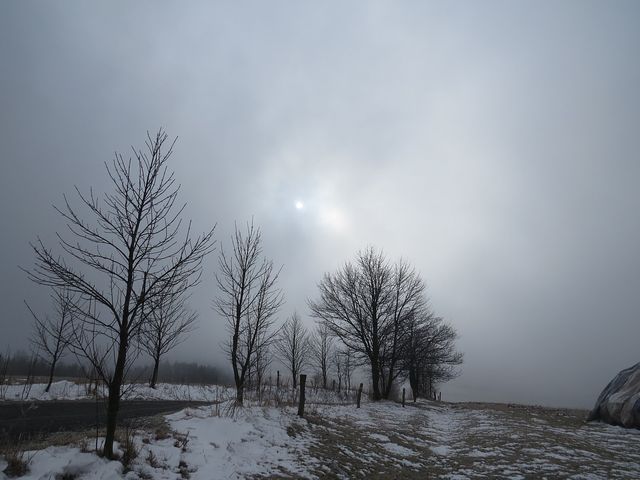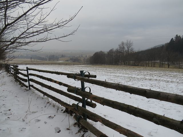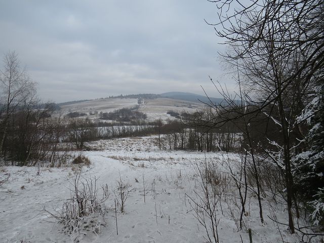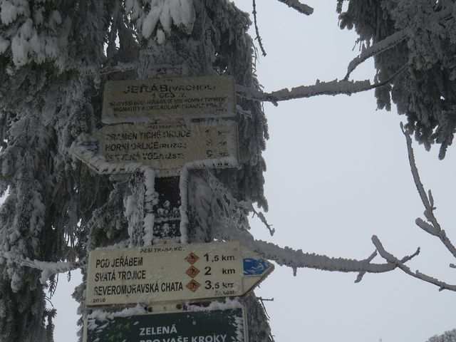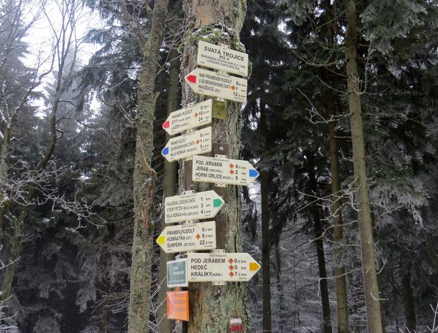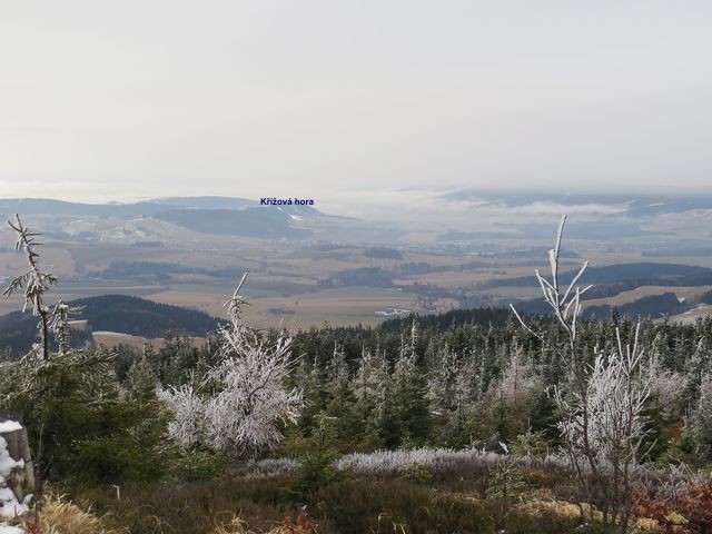 Vrátili jsme se na hlavní silnici do Červené Vody, zamířili do jedné z jejích osmi částí, do Šanova, abychom tu ustájili autíčko a konečně podnikli pěší výlet k nejbližšímu turisticky atraktivnímu cíli, což je Křížová hora (735 m) v Jeřábské vrchovině. Mlha tu nebyla tak vlezlá, a tak jsme stoupali po svahu hory a doufali…