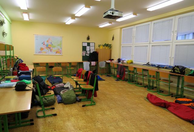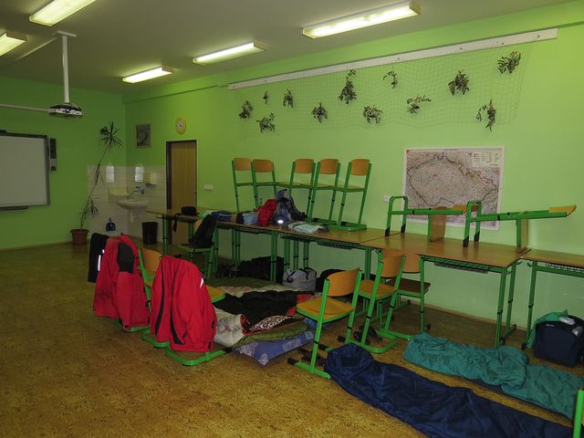 Během chviličky jsme byli zaregistrovaní a s potěšením zjistili, že budeme ubytovaní ve třídě 7C a ve stejné budově nám poskytnou kuchařky ze školní jídelny stravovací servis.