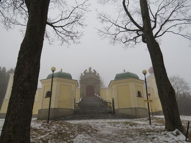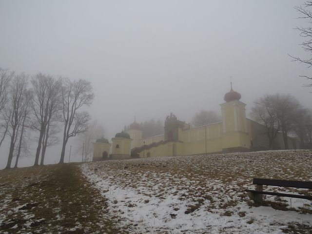 V mlze a po klouzavé svažité cestě jsme jako kajícníci vyšplhali na Horu k Matce Boží, ale hlavní vchod zůstal zavřen a stěny kolem kostela se netvářily přátelsky.