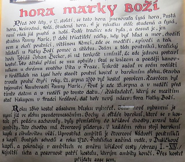Odedávna chodívali touto cestou lidé ke studni Panny Marie prosit o ochranu, až zdejší rodák, pozdější královéhradecký biskup Tobiáš Jan Becker (1646–1710) prosadil stavbu kostela. Oltář byl ozdoben obrazem Panny Marie Sněžné podle originálu z římského chrámu Santa Maria Maggiore, a ten prý maloval sám evangelista sv. Lukáš – z Lysé hory byla Hora Matky Boží.