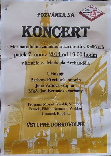 Pak se konal, stejně jako na minulém srazu v Jilemnici, kde jsme kvůli mým potížím se zlobivou nohou nebyli, koncert duchovní hudby, který organizačně zajistil emeritní předseda KČT Ing. Jan Havelka. Zpívaly mladé turistky Barbora Přechová a Jana Váňová, které doprovázel na varhany MgA. Jan Bernátek – zcela zaplněným kostelem zněla překrásná hudba a zpěv – byli jsme nadšení!
