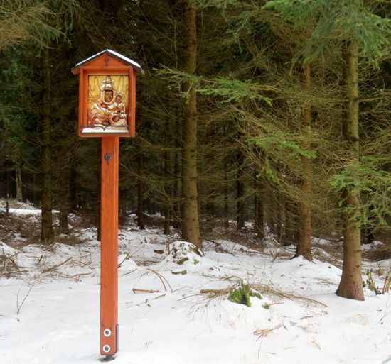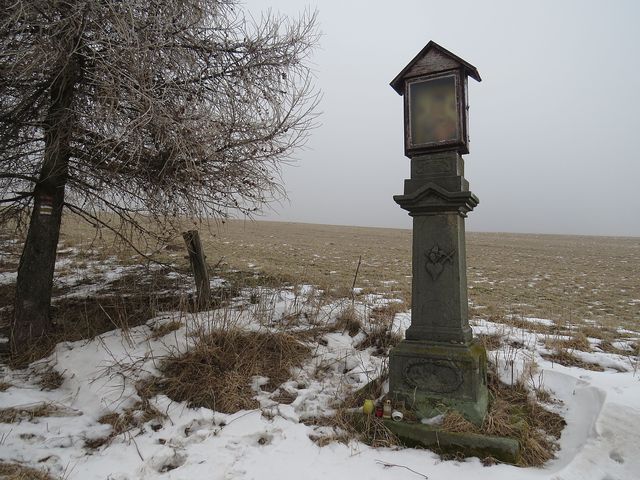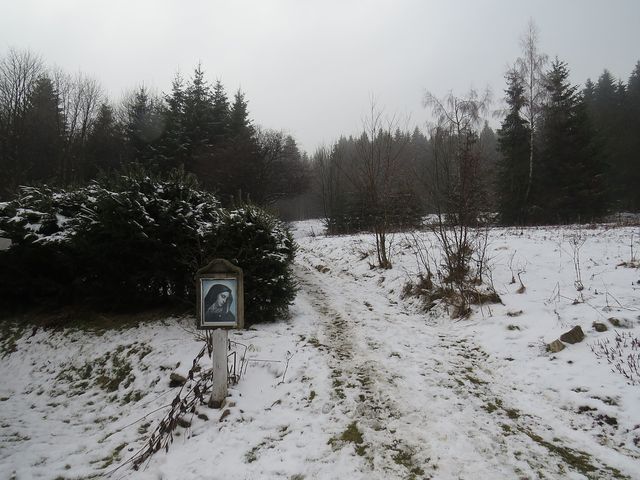 Na rozcestí pod svahem Jeřábu jsme přešli na modrou značku, zastavili se na kraji lesa u sloupku s mariánským obrazem