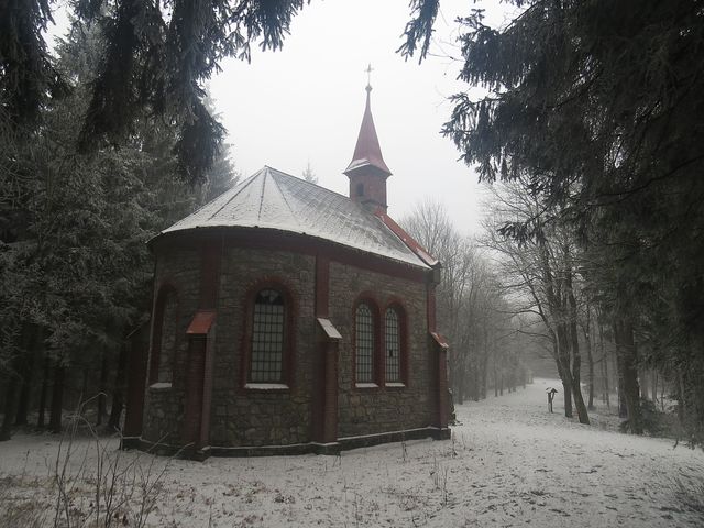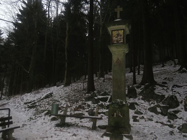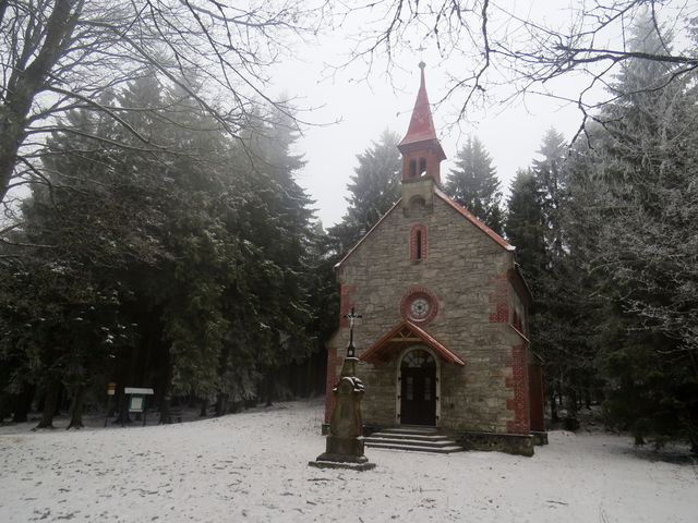 Popovídali jsme si o pravděpodobných výhledech a rychle na další štaci, třeba bude líp. Sestoupili jsme na východní úpatí ke kamenné kapli Svaté Trojice z konce 19. století vybudované na místě původní dřevěné kaple, která byla poděkováním za záchranu obyvatel Králík před Prusy ve Slezských válkách (pol. 18. století).