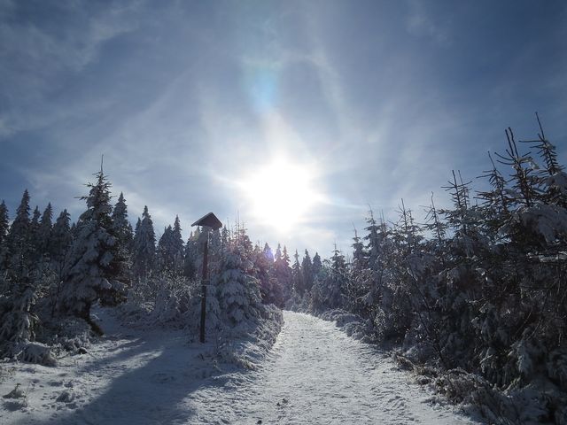 Na rozcestí Hvězda jsme přešli na sestupovou modrou značku směrem do Červené Vody – s každým klouzavým krokem při klesání se okolí halilo do mlhy a my jsme se radovali, že jsme zvolili Mladkovský hřeben, který požíval dnes sluneční přízně.