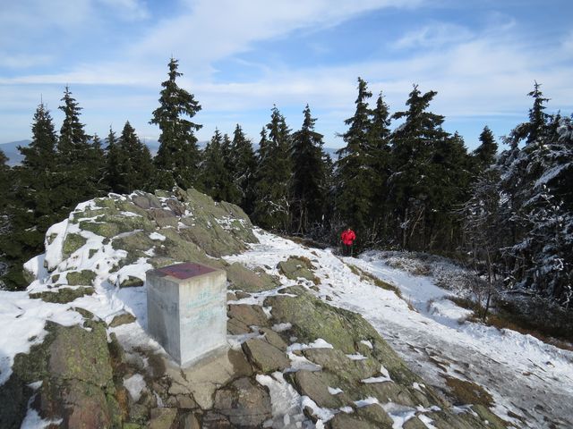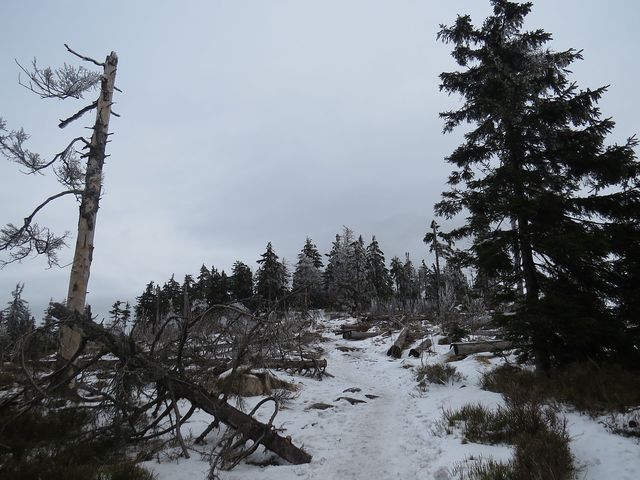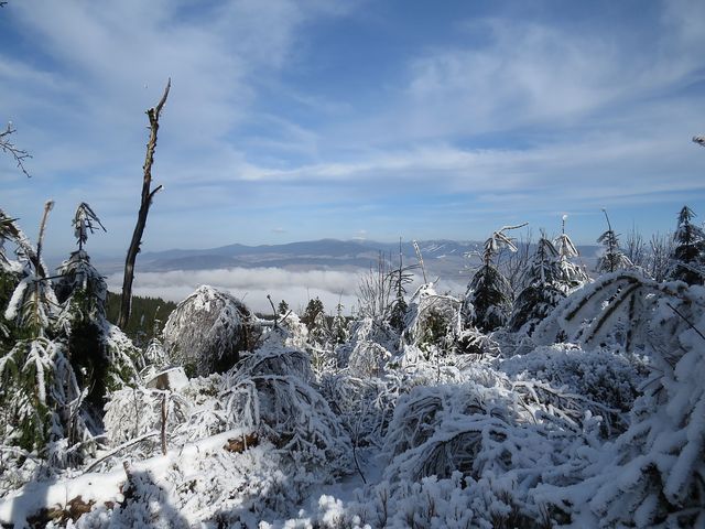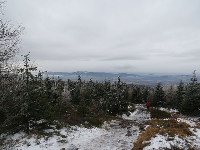 a podstoupili asi půlkilometrový prudký a velice klouzavý výstup po ČTZ na hřeben, po kterém už jsme pohodlně došli k polské hranici, po ní stoupali jižním hřbetem na Klepý (1143 m) a užívali si výhledů.
