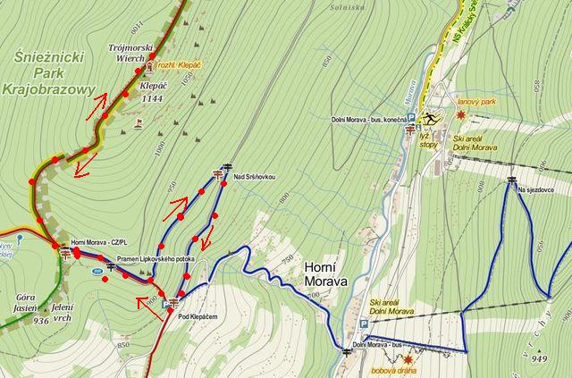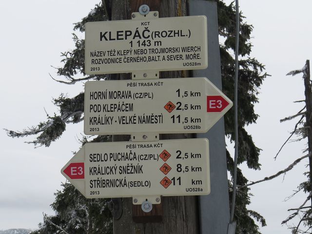 O výstup na Klepý jsme stáli kvůli jeho jedinečnosti – je nazýván střechou Evropy – z jeho svahů tečou vody do třech moří, proto ho Poláci nazývají Trójmorski Wierch – západně, tedy na polskou stranu, odtékají vody do Baltského moře, na východ stékají pramínky do řeky Moravy a s ní do Černého moře, na jih teče Lipkovský potok, který se po 13 kilometrech samostatnosti vlévá do Tiché Orlice a tedy s Labem doputuje do Severního moře.
