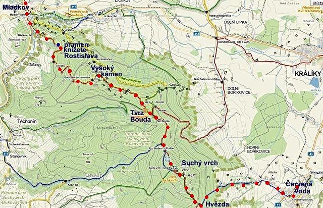 Měli jsme v plánu značenou turistickou cestu po hřebeni na Suchý vrch, ačkoliv víme o existenci NS Betonová hranice, která vede z Mladkova po svazích Vysokého kamene a umožní poznat objekty čsl. opevnění vybudované před II. světovou válkou na obranu před Německem.
