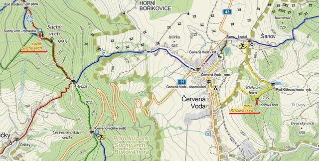 Když jsme projeli městem Štíty a mířili stále k severu, vpravo před námi se objevily kopce patřící k Hrubému Jeseníku a vlevo se v mlze rýsoval hřeben Bukovohorské hornatiny, což je prý nejzazší jihovýchodní cíp Orlických hor. Po pár kilometrech jsme dojeli na silničku mířící do Červenovodského sedla, rozdělujícího přírodní park Suchý vrch-Buková hora na dvě části – Na Bukové hoře (958 m) je vyhlášený lyžařský areál, na nejvyšším kopci, Suchém vrchu (995 m), obnovená Kramářova chata a rozhledna – tam byl jeden z plánovaných návštěvních bodů naší cesty.