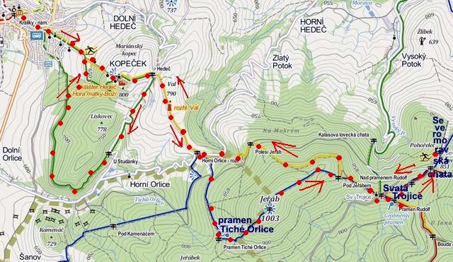 a těšili se k prameni Tiché Orlice, k němuž jsme museli hezky do výšky 850 m – na západním svahu Jeřábu nad obcí Horní Orlice vyvěrá vydatný pramen.