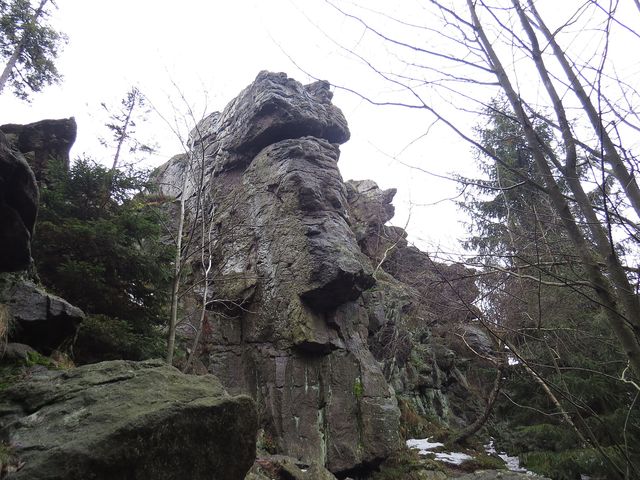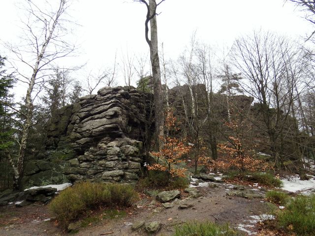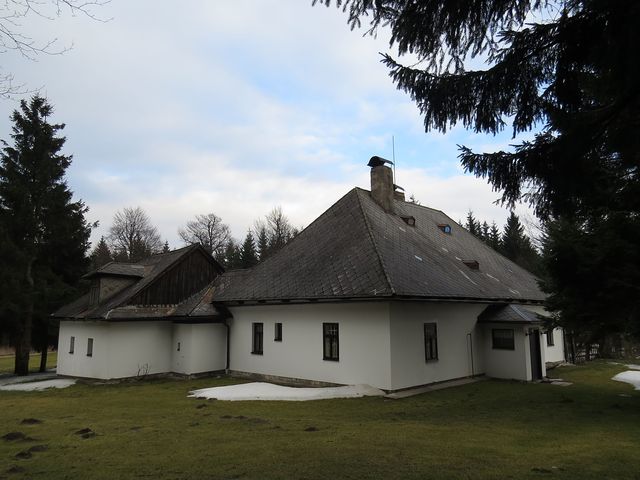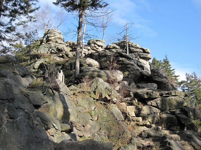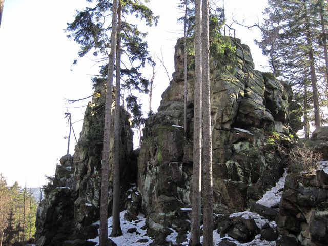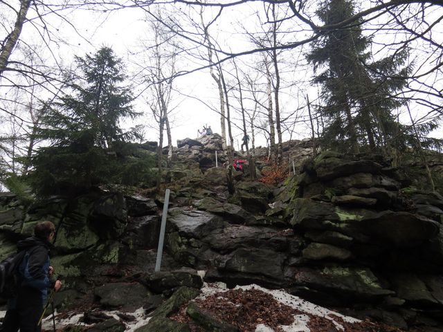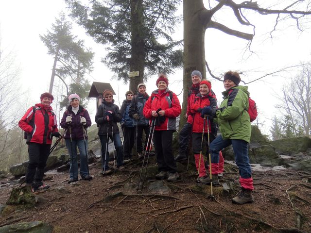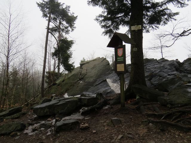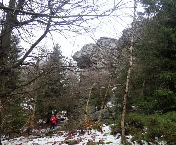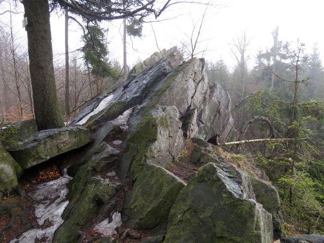 Po příjezdu do Třech Studní (v pátek 21. února 2014) jsme odložili zavazadla v penzionu a se skupinkou přátel jsme v 9:30 nedočkavě vyrazili do terénu – modře značená cesta vedla přes Brožovu skalku, která vzhledem ke své nadmořské výšce (785 m) setrvávala dosud v mlze – ta ale nejevila známky neústupnosti.
