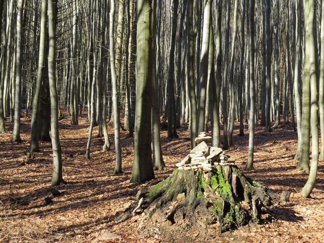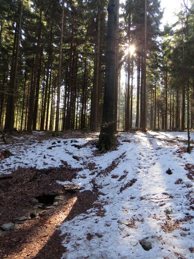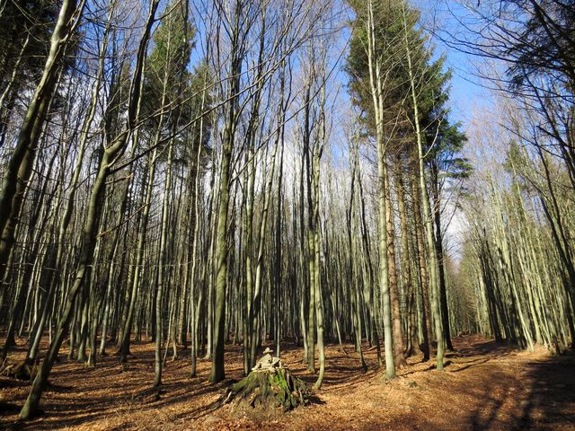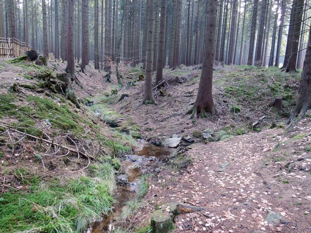 Stále jsme mírně stoupali a s námi i sluníčko, takže na Fryšavském kopci už jsme si užívali hry jeho paprsků mezi stromy zdejších nekonečných lesů. Ty jsou pramennou oblastí několika českých i moravských řek – hluboké kořeny mohutných buků zadržují vodu a nedovolí jí odtékat po povrchu, ve svazích pak vyvěrá a pramínky se formují ve větší toky, které v konečné fázi končí buď v Severním nebo Černém moři – nedaleko Žákovy hory probíhá hlavní evropské rozvodí.