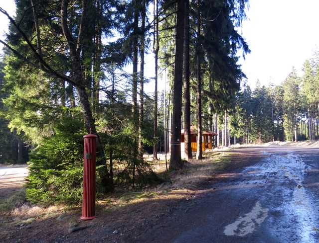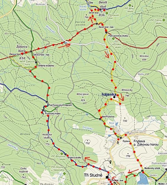 Z křižovatky pod Žákovou horou jsme se vydali po červeně značené cestě směrem k Devíti skalám, podle přesného měření za využití nedalekého geodetického bodu jen o jeden metr nižším nežli nejvyšší Javořice (837 m).