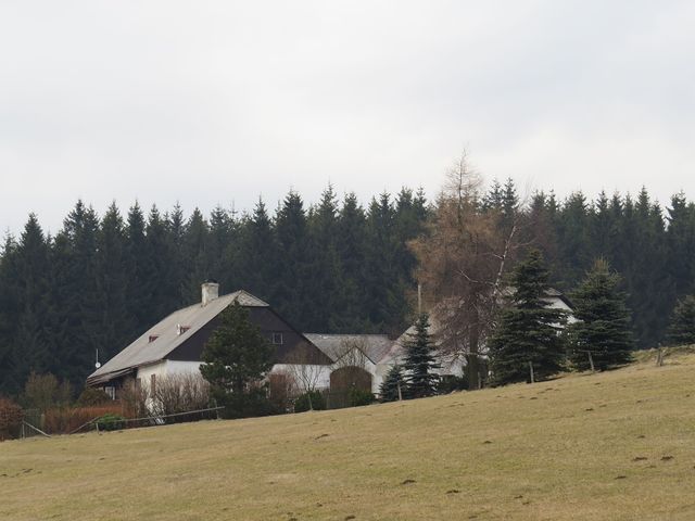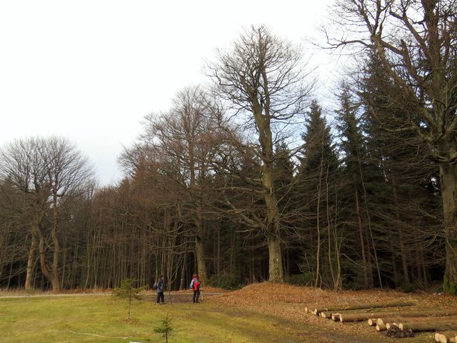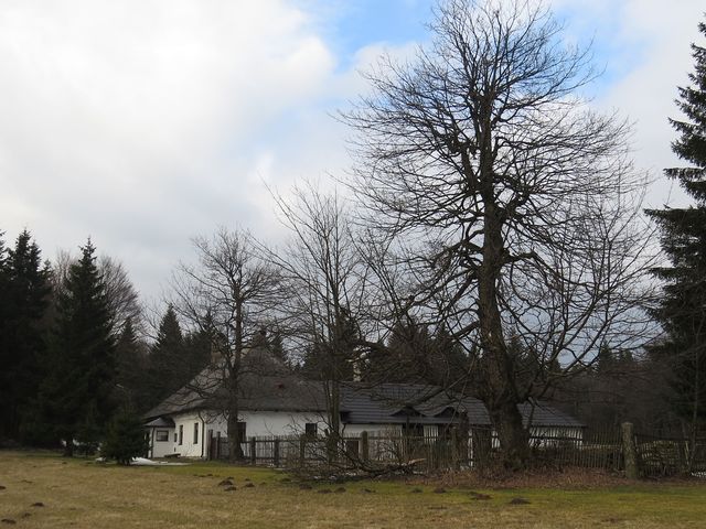 Žlutá značka nás lesní cestou vedla k Fryšavě – samozřejmě jsme se zastavili nad vesnicí na holém kopci s dvěma hájenkami, zvaném místně Samoty. Zde, ve výšce asi 800 metrů jsme obdivovali nejen mohutné prastaré stromy,