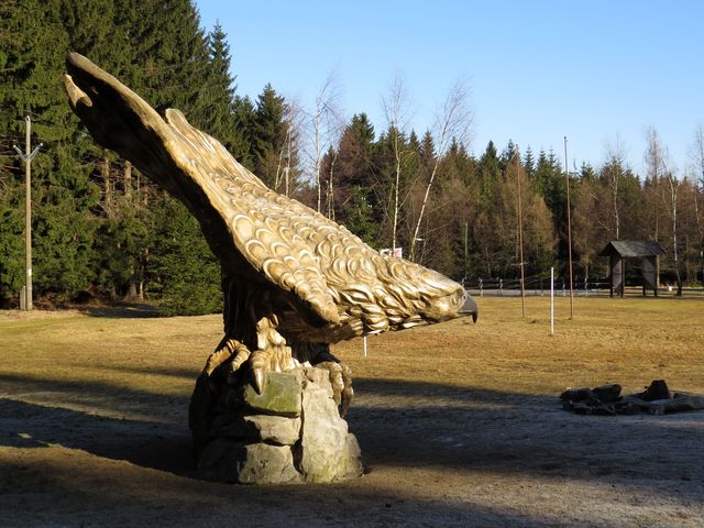 Medlovský rybník jsme obešli z druhé strany a dostali se tak do osady Yukon, abychom se potěšili zdejšími plastikami Michala Olšiaka (*1978):