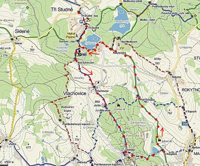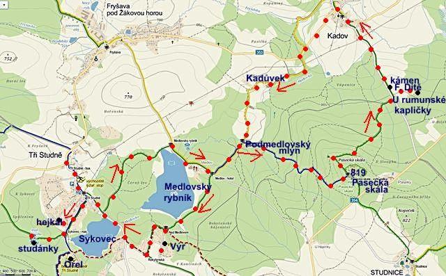 teď zbývalo obratně našlapovat na četné zmrazky a užít si zpáteční cestu na Tři Studně. Je na čase zařadit mapku dnešního putování: