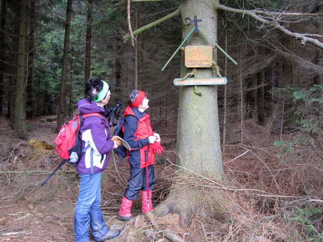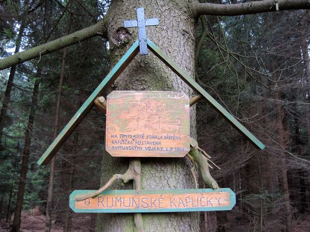 Když jsme seběhli dolů ke kadovské silnici, zaujala nás cedulka s šipkou Rumunská kaplička a při pohledu do mapy jsme zjistili, že někde v tomto prostoru by měla být – i udělali jsme rojnici, pročesali les a nedali pokoj, dokud jsme zmíněné místo nenašli! 🙂