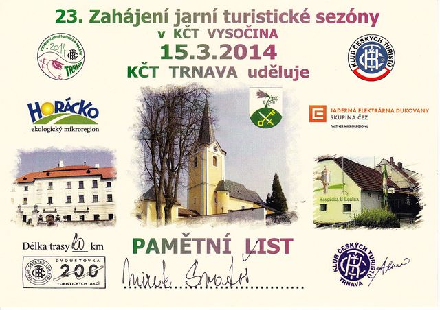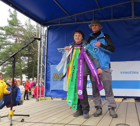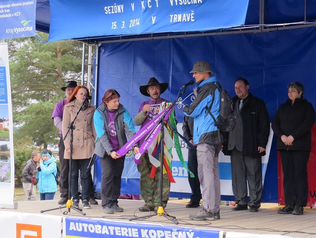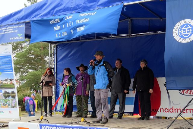 Poté co turisty přivítali starosta Trnavy Břetislav Česnek a starosta Budišova Petr Piňos, otočili za zvuků fanfáry předseda KČT Trnava František Dlabáč a organizátorka Jarka Adamová symbolickým klíčem, přidali na něj třiadvacátou pamětní stuhu a turistická sezona 2014 na Vysočině byla zahájena!