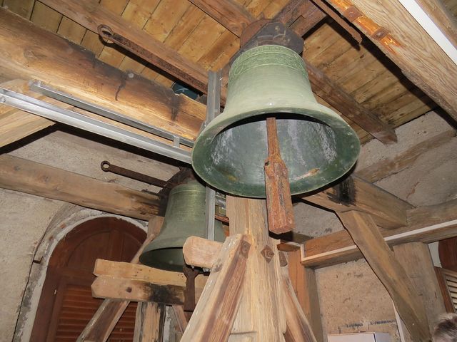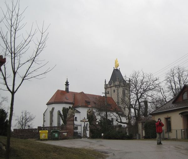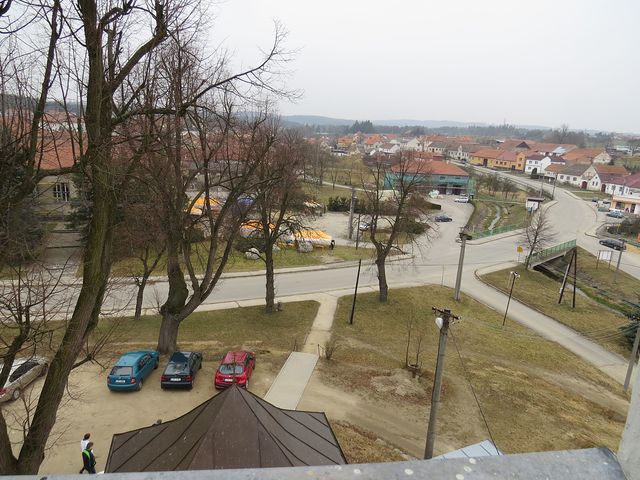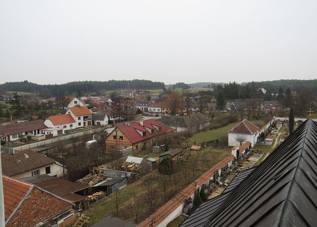 Využili jsme možnosti vystoupit na věž kostela sv. Petra a Pavla a pokochat se výhledem – vydali jsme se tam mezi posledními, a tak jsme popatřili na osiřelou náves,
