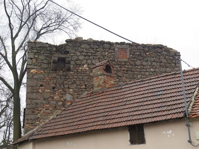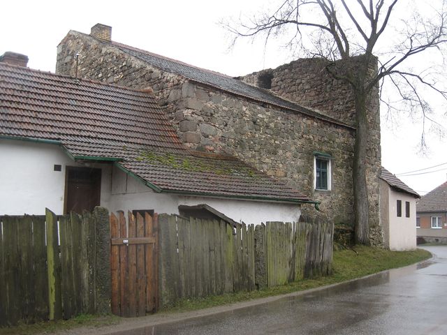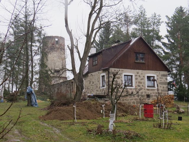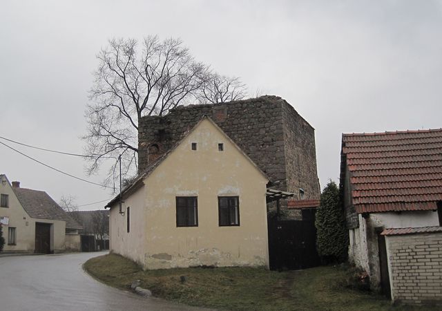 Na infotabuli jsme se dočetli, že tvrz o velikosti 12,7 x 11,5 metru bývala asi deset metrů vysoká; za dvoumetrovými zdmi jsou dvě místnosti a černá kuchyně, do patra vedou strmé kamenné schody. Ve druhém podlaží jsou pozůstatky prevétu – ten vystupuje z venkovní strany podpírán krakorci.