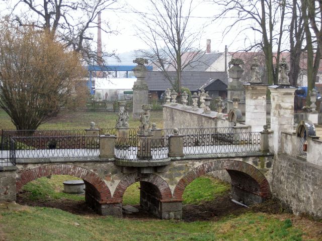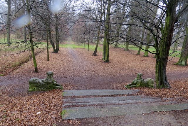 Hustý déšť a ledový vítr rozhodně nepřály procházkám po parku, ale základní představu o uspořádání jsme si udělali, jeden ze čtyř rybníčků dosud hlídají tajemné sfingy.