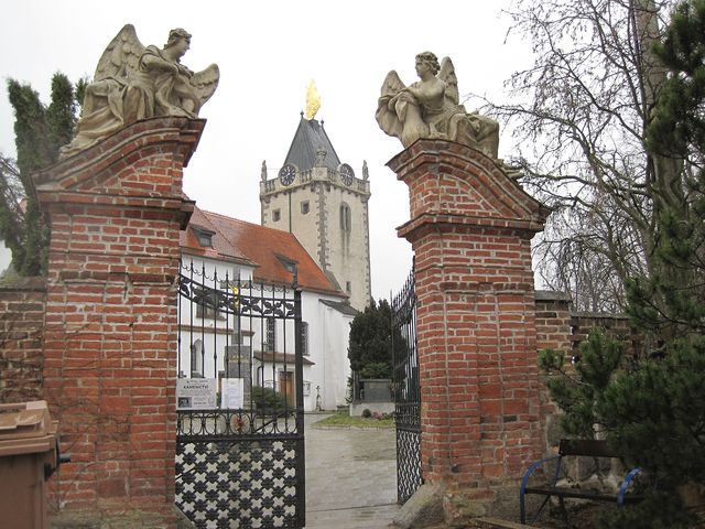 Na balustrádě jsou sochy sv. Floriána, sv. Šebestiána, sv. Antonína a sv. Isidora – k objektu na návrší divák vzhlíží, a je to pohled velmi působivý. Ještě plné oči těch oblých křivek zakrátko překvapeně hledí na sochy andělů u vstupní brány ke kostelu obklopenému hřbitovem.