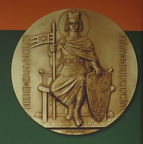 Na infotabuli u Louňovic pod Blaníkem jsme našli i obrázek svatováclavské medaile, jejíž originál jsme před časem viděli v pelhřimovském muzeu – autorem je Josef Šejnost, medailér z Vysočiny. (M+M Svatošovi – Přechod Jihlavských vrchů – Křemešník)