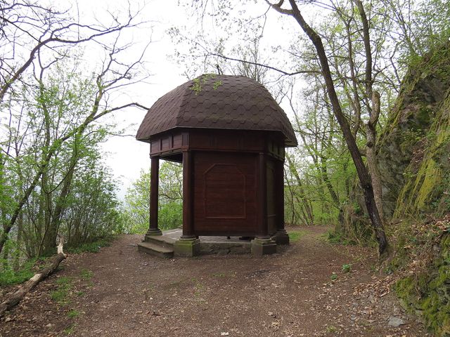 když jsme vstoupili do křivoklátských lesů. Červeně značená cesta prochází po vrstevnici chráněným územím zvaným Brdatka – masiv skalnatého svahu nad Berounkou má návštěvníkům co nabídnout – už v 19. století byly vybudovány vycházkové stezky a podél nich vysázeny okrasné keře (ty jsme však nikde nenalezli), vznikl i odpočinkový a vyhlídkový dřevěný altán Gloriet.
