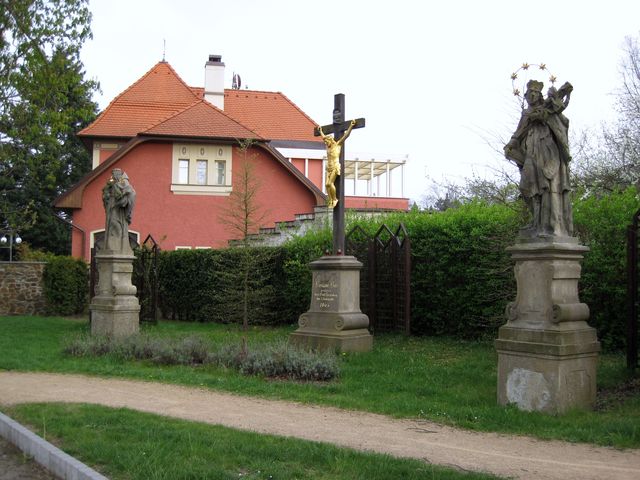 Postáli jsme u „Kalvárie“, což jsou pískovcové sochy sv. Jana Nepomuckého a sv. Antonína Paduánského umístěné po stranách dubového kříže – zde se prý cestou na šichtu zastavovali horníci a modlili se, aby z dolu Betynka šťastně vyfárali…