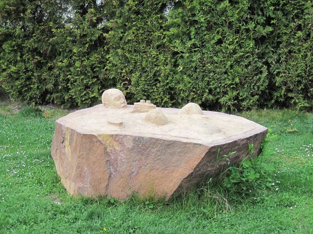 Zaujala nás i pískovcová skulptura místního rodáka Karla Kellnera, kterou, inspirován vzpomínkami na dětství, vytvořil při sochařském sympoziu v roce 2010 a nazval Na Pánovce (chodívali se koupat do rybníka na Pánově louce, který jsme před chviličkou na obrázku viděli) 🙂