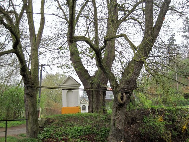 Druhá kaplička, ta se žlutou podezdívkou, obklopená třemi památnými lipami, je tzv. vzdorokaplička z roku 1908 – jakýsi spor o přesné místo atentátu je z pohledu staletí malicherný…