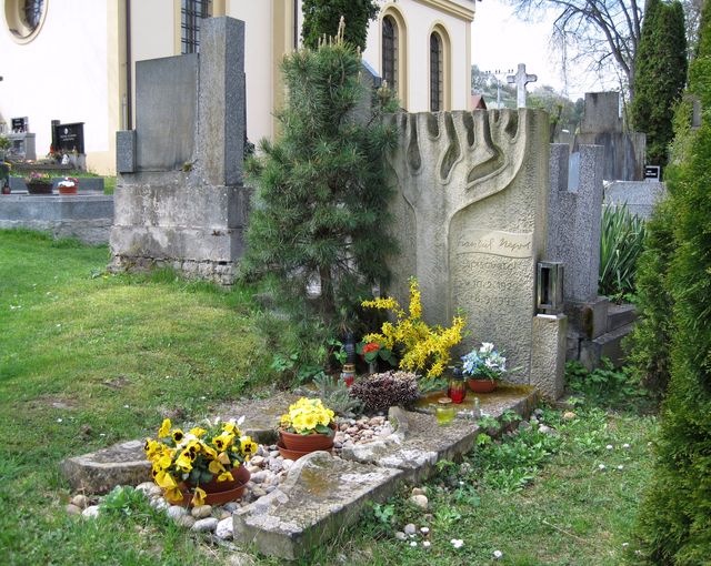 Dříve než jsme se ze Stradonic vrátili do Nižboru, abychom odtud pokračovali dále k východu, zastavili jsme se na hřbitově u hrobu spisovatele Františka Nepila (1929–1995), rodáka z nedalekého Hýskova, který měl ve Stradonicích chalupu a často tu pobýval.